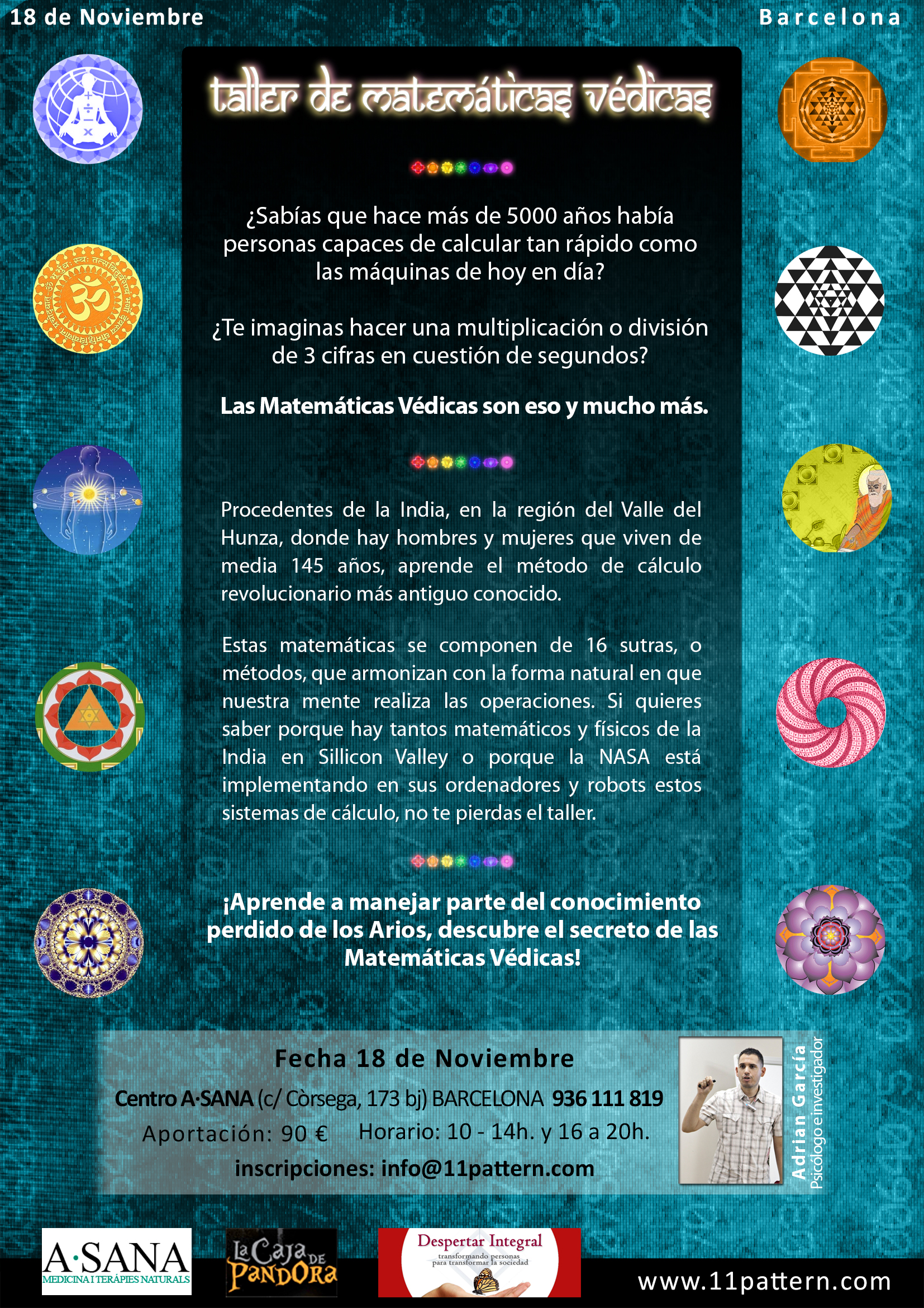 IMPORTANTE! Por temas logísticos ha habido un cambio de fecha para el taller de Matemáticas Védicas que finalmente se realizará el domingo 18 de noviembre. Eso sí, en el mismo lugar el centro Amor Sana. Para ver todos los detalles pulsad sobre el cartel.